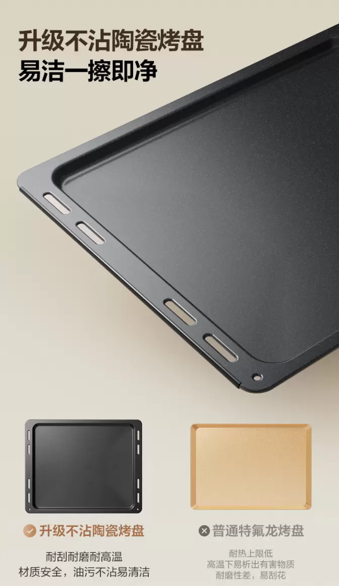 烘焙完之后,清洁工作也不能忽视。普通烤箱内胆往往采用陶瓷镀膜、普通特氟龙烤盘,不仅不耐高温,高温下还可能析出有害物质,而且耐磨性差,易刮花,顽固油污不易清洁,而这款美的P40pro三代烤箱,其内胆采用四面搪瓷内胆,同时烤盘为不沾陶瓷烤盘,抽拉丝滑不卡顿,无需垫纸更省心,一机满足从烘焙到轻食、从家常菜到派对餐等全家庭需求,清洁少、占地小、体验更升级。