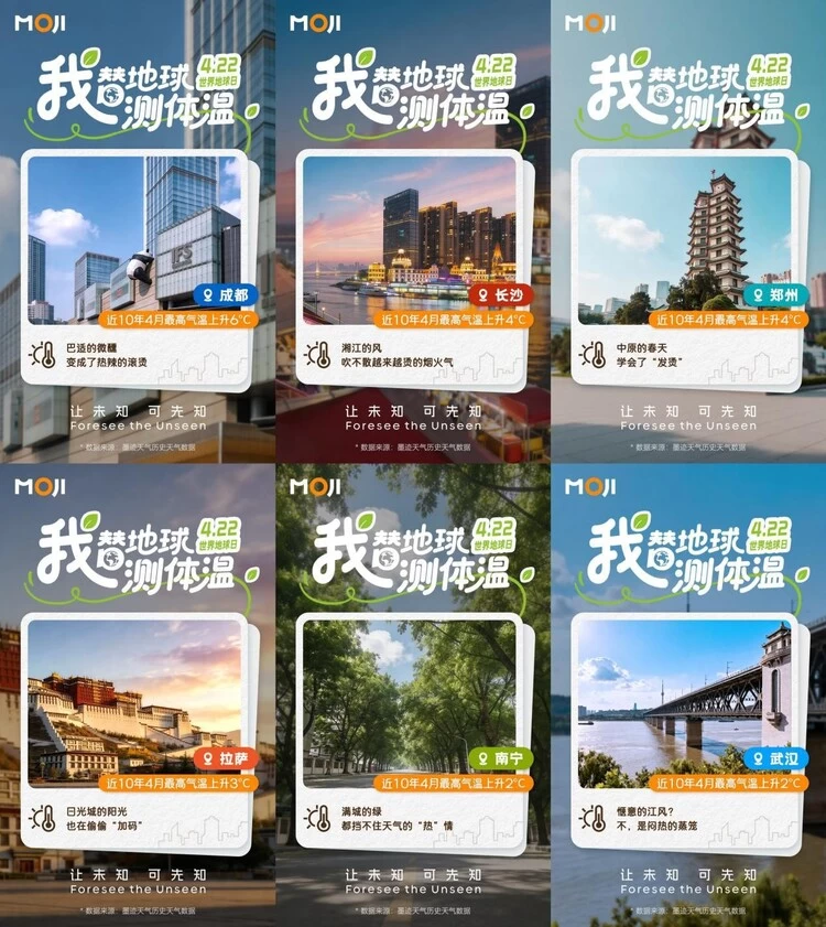 活动期间,墨迹天气发布《地球的度数·中国城市体温图鉴》系列海报,选取成都、长沙、武汉等六座城市,直观展示其2015年与2025年4月最高气温对比数据,数据显示成都25年4月最高气温高出15年6℃,郑州和长沙高出4℃、拉萨高出3℃,在全球变暖的大背景下,气温每上升0.1℃都会给生态环境带来不可逆的影响。墨迹天气将抽象变暖转化为可视化的温差,让用户真切感知全球变暖对自身生活环境的影响。