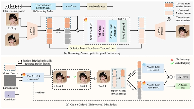 其中一项技术是Oracle-Guided Distillation(双向蒸馏机制)。在这一机制中,模型训练阶段引入“教师模型”作为参考,通过Ground Truth作为约束基准,对生成过程进行校准。这种方式可以在训练阶段强化人物特征的一致性,从而减少长视频生成中出现的身份漂移现象。