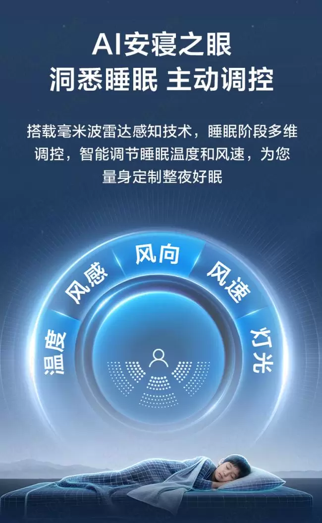 痛点一:后半夜总被冻醒或热醒。传统空调固守恒温模式,而人体睡眠时体温呈现“入睡下降—深睡平稳—晨起回升”的自然节律。恒定不变的送风温度,往往导致深睡期感到寒冷,或者在换季时忽冷忽热,打断宝贵的深睡眠。