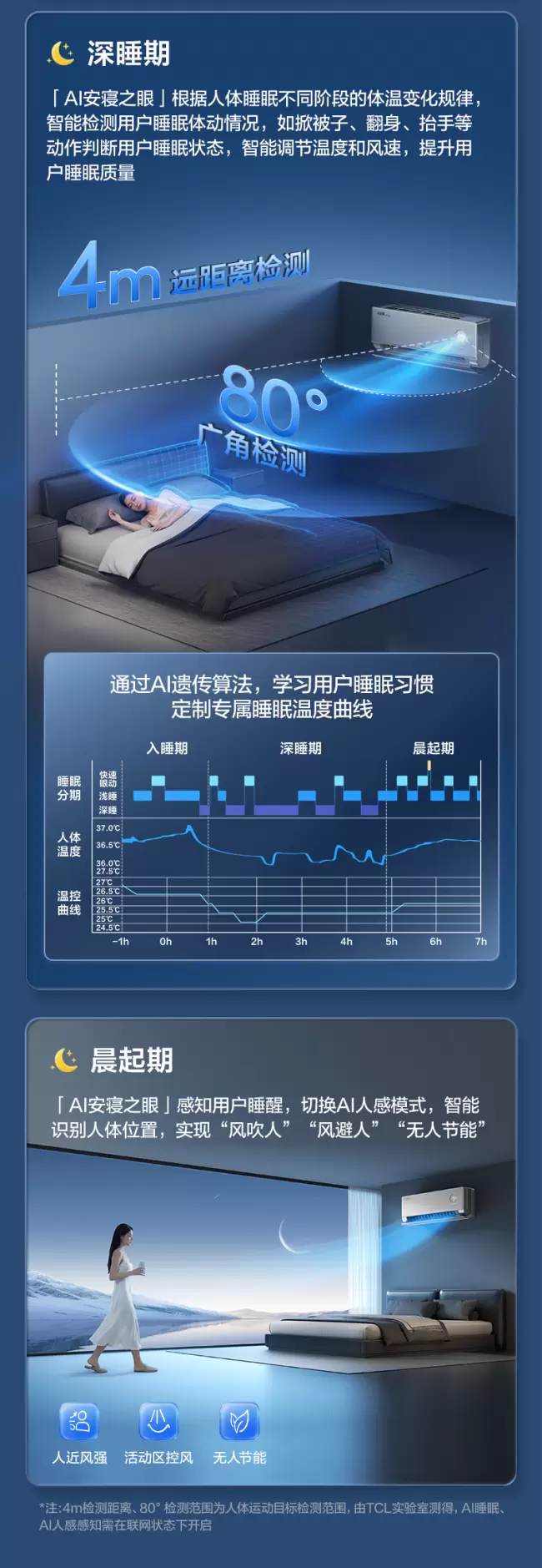 当AI安寝之眼感知用户准备睡觉时,空调会智能开启“AI睡眠”模式,灯光、风感、风速同步调节到最舒服的助眠状态;深睡时,TCL小蓝翼P6UltraAI舒适睡眠空调智能调节温度和风速,避免传统空调“后半夜冻醒”的尴尬;晨起后,TCL小蓝翼P6UltraAI舒适睡眠空调感知用户睡醒,自动切换AI人感模式,可实现风追人吹、风避人吹、人近风柔、人走节能等细腻体验。更厉害的是,它还能通过AI遗传算法持续学习用户的睡眠习惯,为用户定制专属睡眠温度曲线,让空调越用越懂你的睡眠。