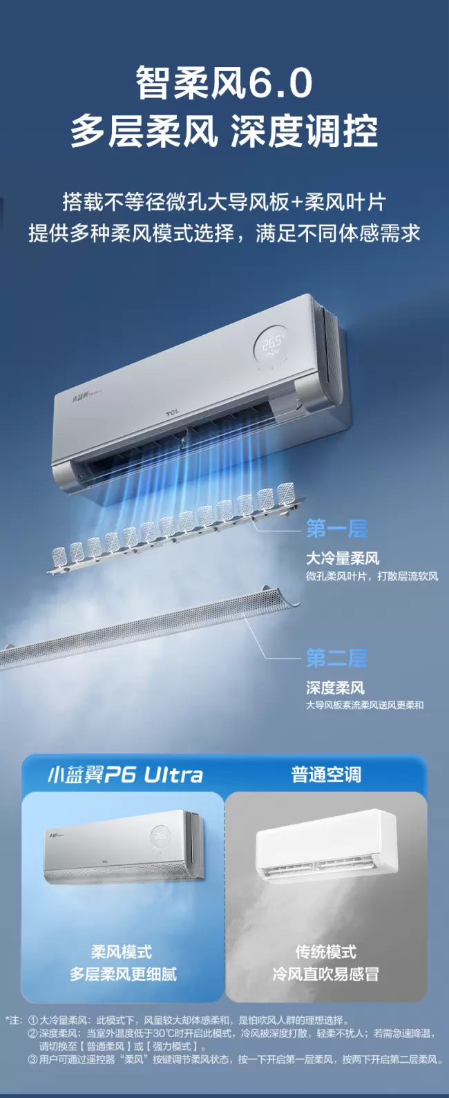 在送风体验上,TCL小蓝翼P6 UltraAI舒适睡眠空调搭载智柔风6.0技术,搭载不等径微孔大导风板+柔风叶片提供多种柔风模式选择,将传统空调的“硬风”分解为柔和气流,实现立体送风、送风不直吹,有效规避冷风直吹引发的健康问题。