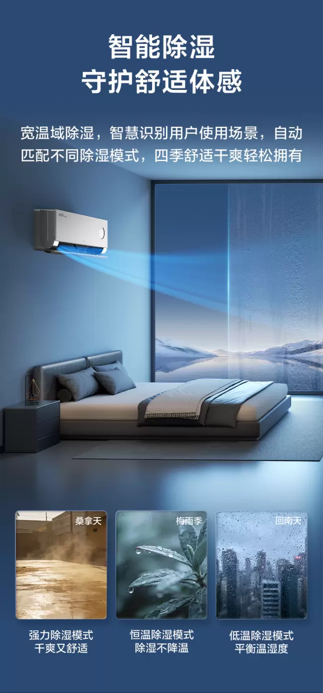 痛点四:空气潮湿或干燥影响体感。梅雨季、回南天的黏腻潮湿,或是冬季制热导致的干燥,都让睡眠质量大打折扣。