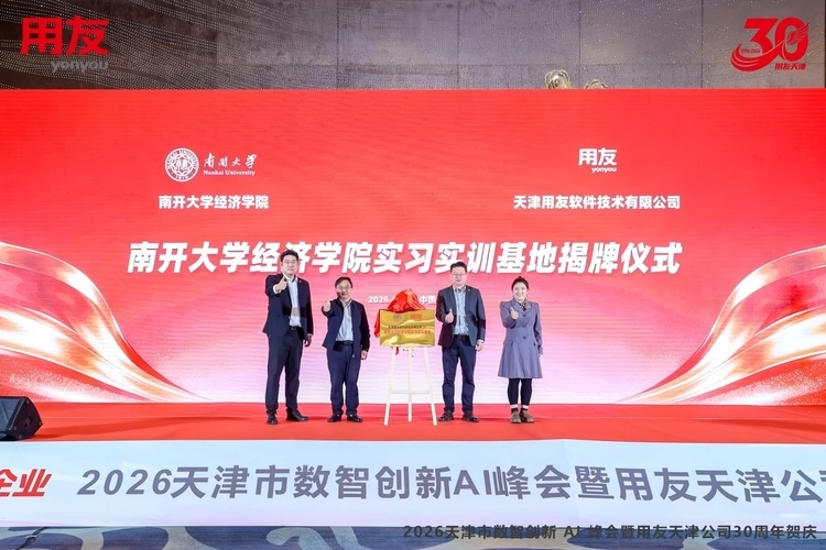 用友天津公司与南开大学经济学院联合成立“实习实训基地”,用友天津公司总经理吴克清与南开大学经济学院教授、博士生导师、副院长严兵现场进行揭牌仪式,学院依托用友公司数智化项目、AI智能业务场景,帮助更多本科、硕士学子打造沉浸式产学研AI实践,使学生能够进一步深入理解、拓宽本领域的专业知识,成为具有较强的解决实际问题的能力,能够承担专业技术或管理工作、具有良好的职业素养的,适应数字经济发展的“新文科”高层次应用型专门人才。