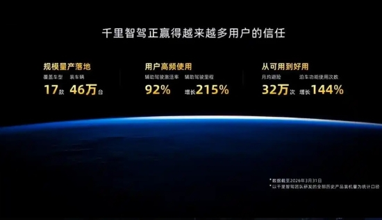 目前千里科技已完成智能驾驶、智能座舱、Robotaxi全产业链布局。赵明介绍,截至2026年3月31日,千里智驾技术已搭载17款车型、合计46万辆汽车,辅助驾驶激活率高达92%。值得关注的是,千里智驾从ASD3.0迭代至4.0仅用时3个月,ASD3.0首发即实现30万辆车的快速适配。