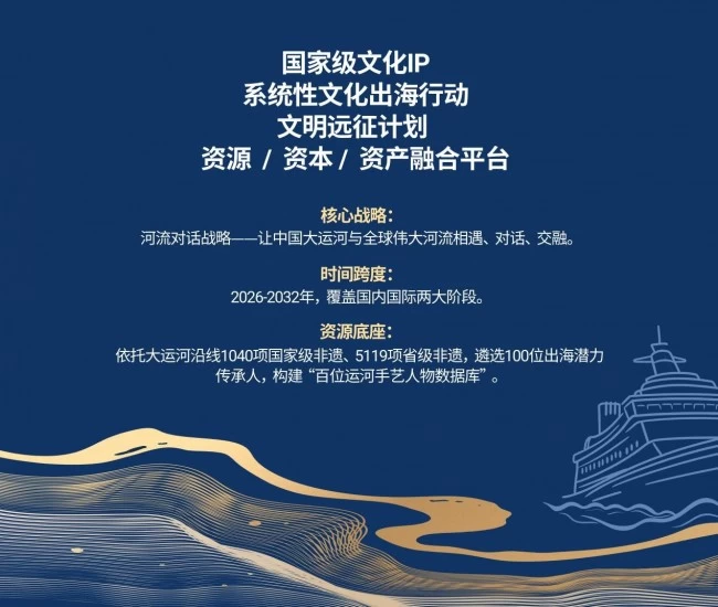 在国家战略的指引下,近日,致力于标杆性文化IP全球运营的创新型企业——上海运河之旅企业发展有限公司(Shanghai Grand Canal Cultural Development Co., Ltd.,简称GCCD)正式对外发布其核心文化项目“运河之旅”。该项目以大运河全线为精神母体,以百位非遗手艺人与表演艺术传承人为活态载体,积极响应“十五五”规划关于“鼓励更多文化企业和优秀文化产品走向世界”的战略部署,旨在打造一项系统性、全球化的文化出海行动计划,让中国之美走向世界,让中国手艺与艺术连接全球心灵。
