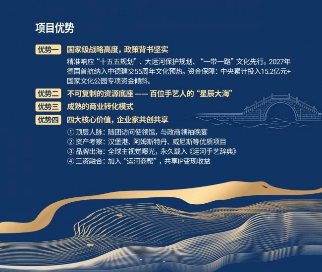 公司业务涵盖三大板块:一是以“运河之旅”为核心的文化IP全球运营;二是承接一线艺人大型演出的标杆性演艺IP运营;三是面向企业与个人的高端商业资源整合服务,包括顶层人脉构建、品牌出海战略咨询、欧洲优质资产考察及“资源-资本-资产”融合对接。