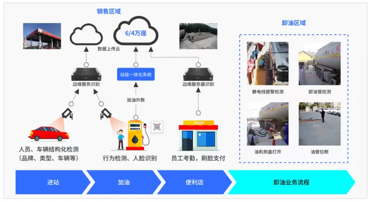 销售板块:销售区域人流车流复杂,方案可重点识别未戴安全帽、吸烟、打电话、车辆违规闯入等危险情况,并支持员工考勤等站级一体化应用;在卸油封闭区域,可重点监测卸油合规性,包括卸油前静电释放、灭火器摆放、卸油操作顺序等。