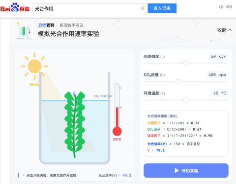 此外,百科还运用了多模态技术,实现信息的3D和VR全景展示。动态百科则利用生成式UI,可以对概念进行动态模拟,如:用户在百科上用鼠标点击即可模拟光合作用原理、体验DIY剪纸花等。实现了知识的可视化、内容场景化、体验趣味化。