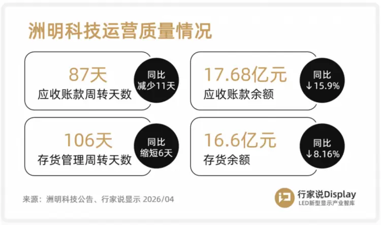 在资产运营效率方面,洲明科技在2025年取得了积极进展,其应收账款周转天数缩短至87天,同比减少11天;同时应收账款余额降至17.68亿元,同比下降15.9%。存货管理亦呈现改善,周转天数缩短6天至106天,存货余额同比下降8.16%至16.6亿元。核心运营指标的“双降”,意味着一笔资金在洲明科技体系内完成“生产-销售-回款”的循环比以前更快了,有效释放了部分营运资金,增强了内部资金的流动性。