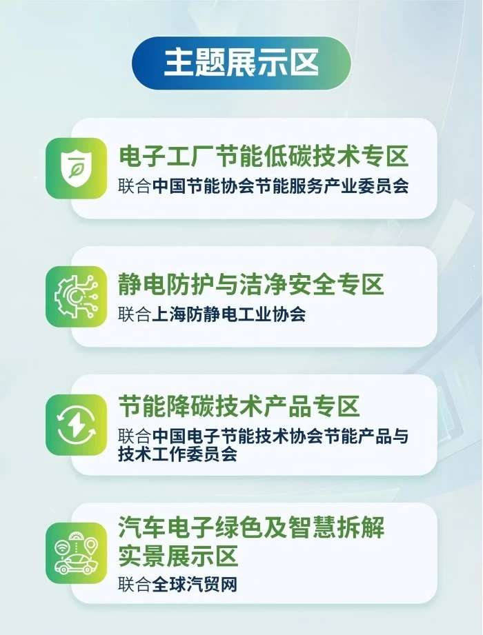 联合中国电子节能技术协会节能产品与技术工作委员会设立"节能降碳技术产品专区",聚焦电子工厂全场景节能需求,“节能降碳技术产品专区”综合展示“绿色低碳技术、装备、模式供应服务商;绿色工厂技术;零碳园区方案;能源与动力设施;绿色、低碳、节能认证检测机构”等节能降碳技术,预计吸引数万家来自电子制造、半导体、电路板、汽车电子等应用领域的工厂,直击厂务、采购、能源及可持续发展部门核心决策者,助力企业抢占政策红利下的市场新机遇。