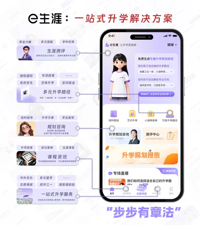 但真正的壁垒在交付:大模型给建议,“e生涯”给出“规划—资源—落地”闭环。规划后直接匹配个性化成长服务(科创、艺体、人文等),有自营更有多元严选第三方。目前“e生涯”已在约70所学校试点,转化10万注册用户,深度测评约6万人,订单转化远超预期。