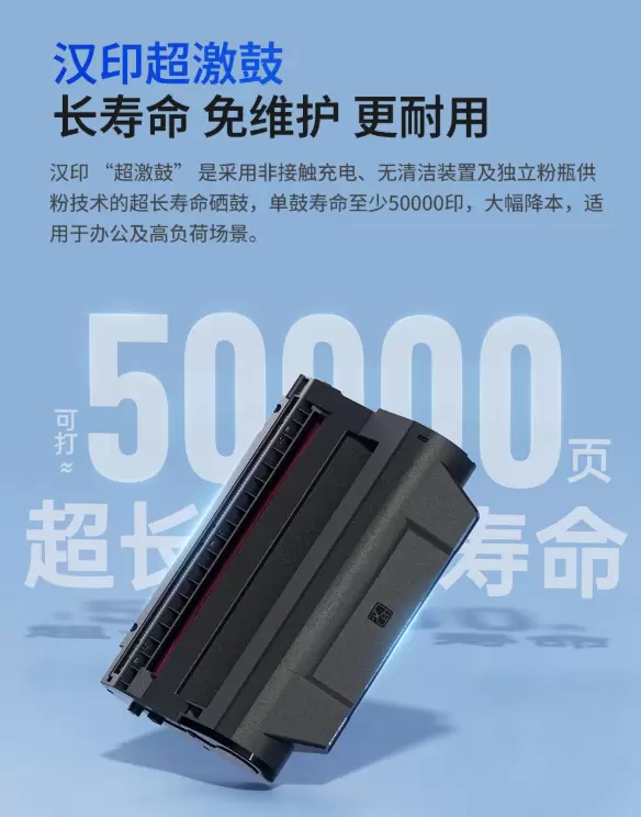 汉印超激鼓依托非接触式充电、无清洁装置、独立粉瓶供粉三大核心创新,将单鼓寿命提升至 50000 页以上,硒鼓成为整机核心配件而非耗材,实现成本、体验、安全、环保全方位升级。