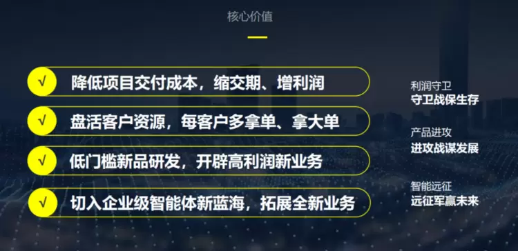 第三,低门槛新品研发,开辟可复制的高利润业务。平台支持将交付项目沉淀为标准化产品,减少定制开发工作量,提高交付效能,带来持续性收入增长。