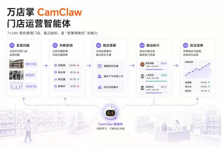 它让系统不再只是“看得见门店”,而是“看得懂哪些细节会影响收入”,也不只是“提出异常提醒”,而是进一步推动运营调整和结果验证。换句话说,万店掌门店管理龙虾CamClaw真正建立的是一套AI驱动的收入优化机制。