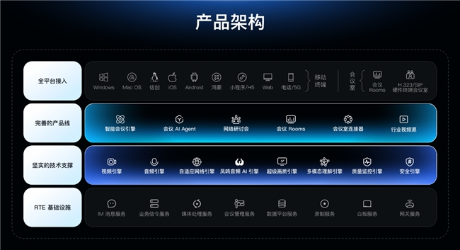 ·分层接入:从纯音视频底座、带会控内核、完整 UI 界面,到贴牌成品,客户可根据自身研发投入选择接入深度。