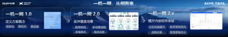●1.0,定义方案概念: 首次提出一机一网概念,围绕“简架构、降成本、易运维”三大核心主张,实现了方案从0到1的跨越;