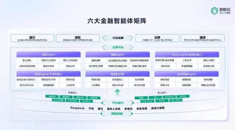 容联云打造六大智能体体系,已实现对金融行业营销、销售、服务全链路的深度覆盖。这六大智能体并非孤立的功能模块,而是以任务执行为目标、以企业私有数据为底座、以人机协作为路径的系统性智能体平台: