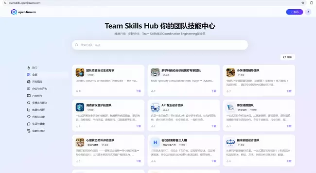 其三,Team Skills Hub构建了开放共享生态。秉持着“协作经验不应被私有化”的理念,openJiuwen配套推出了Team Skills Hub平台,支持上传、检索、下载、共建共享,形成社区协同生态;其内置了八大类别开箱即用 Team Skills,覆盖开发、办公、科研、医疗、金融等场景,亦可提供团队技能自动生成专家,支持快速自定义专属 Team Skills,同时,用户还可一键共享自定义的团队技能至Hub,共建协作生态。