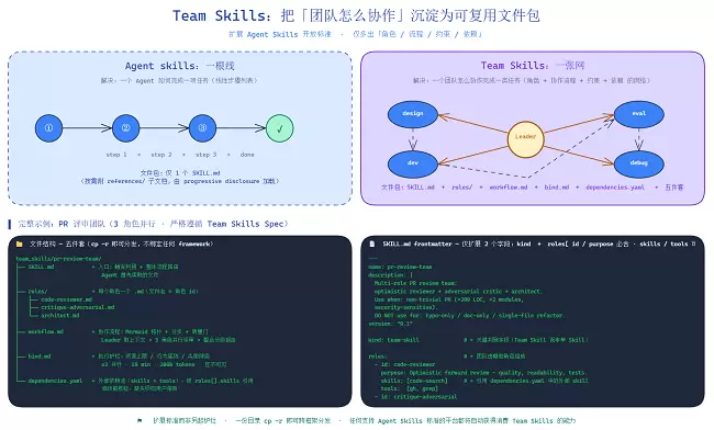基于Coordination Engineering理念,openJiuwen打造了“Agent Team、Team Skills、Team Skills Hub、Team Skills自演进”四大核心能力,构建了从协同到沉淀、从共享到进化的完整技术闭环,让AI团队协作从“一次性尝试”走向“工程化量产”。
