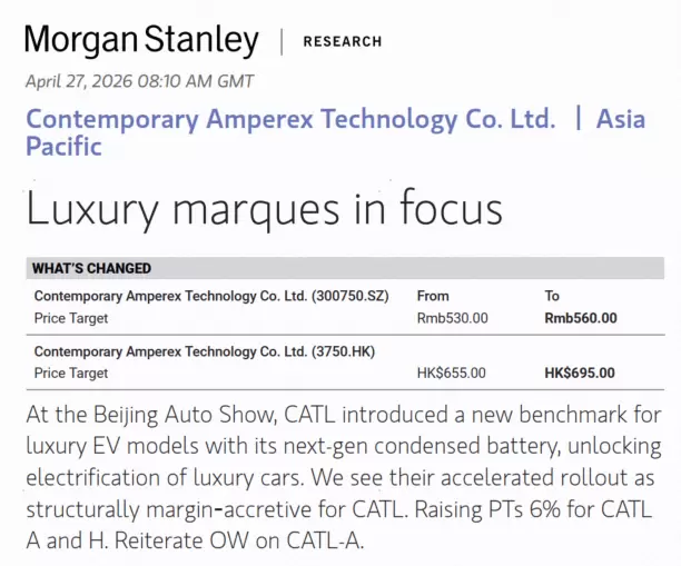 北京国际车展的电池技术之战持续吸引全球资本的关注。摩根士丹利在其4月27日发布的最新研报“Luxury Marques in Focus”中指出,宁德时代(CATL)在北京车展上发布的下一代凝聚态电池,为豪华电动汽车树立了新的性能标杆,有望加速高端车型的电动化进程。该行认为,这一技术突破将对宁德时代的利润结构产生积极影响,因此将其A股和H股目标价分别上调6%至人民币560元和港币695元。