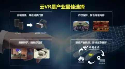 在今年9月13日,中国电信和华为就在“第十届天翼智能生态博览会”上,联合发布了云VR产品。中国电信在当时表示,将和合作伙伴共同部署GPU云计算能力、内容云的渲染能力和8K实时的编码解决处理能力等云VR三大关键能力,技术能力、渲染能力上天翼云,8K的FOV即视长角技术、CDN将逐步实现全面支持。按照中国电信与华为的合作计划,双方将发挥各自优势,基于千兆光宽带、天翼高清、家庭WiFi智能组网和云化渲染技术,打造家庭VR应用场景,争取在未来5年内将云VR打造成智慧家庭下一个千万级业务,为中国电信宽带用户带来创新的沉浸式娱乐体验。