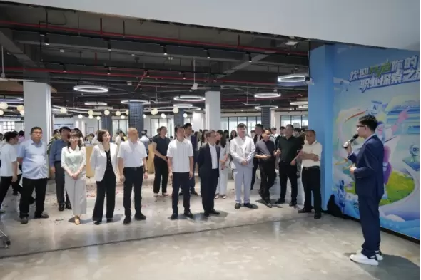 在讲解员引导下,嘉宾们参观大学生职业发展学院的文化氛围展示区、发展历程区、职业规划体验区。文化氛围展示区以AI启航为核心理念,打造沉浸式职业探索场景;发展历程区呈现校企共建实力与全链条育人体系;职业规划体验区展示AI简历诊断、模拟面试等智能服务。