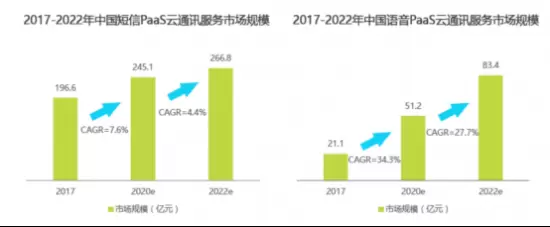 以通信云平台作为基础,国内短信云通信市场在2017年规模为196.6亿元,随着各类互联网服务的发展,短信验证码和信息通知类服务的应用继续增加,至2020年将以7.6%的年复合增长率增长至245.1亿元。2020年之后,短信的通知形式受到达率和用户使用习惯影响增速将有所放缓,预计至2022年市场规模为266.8亿元。语音云通信市场的随起步稍晚,2017年的市场规模为21.1亿元,与短信市场的差距较大。但随着应用内的隐号通话、语音验证码、语音通知等服务场景日益成熟,市场将保持20%以上的高速增长,预计至2022年市场规模为83.4亿元。