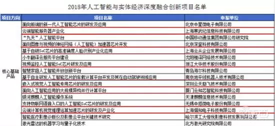 从9月5日工信部公示的2018年人工智能与实体经济深度融合创新项目名单可以看到,中星微电子、寒武纪、熠知电子(Think Force)、深鉴科技、地平线机器人、云天励飞、云知芯、中感微电子以及熠知电子关于AI芯片的项目分别上榜。