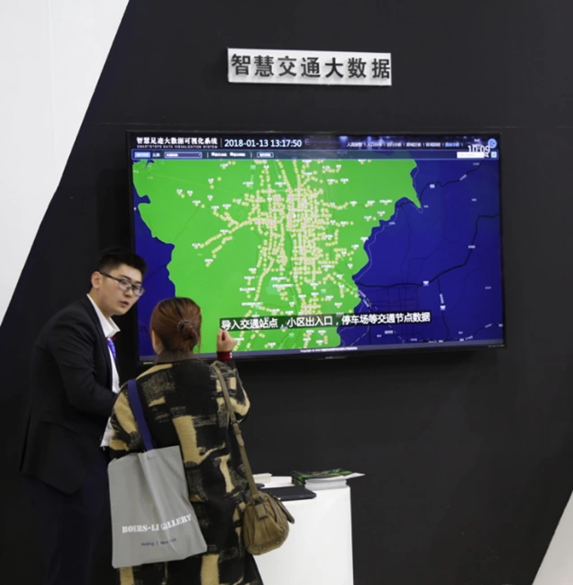 智慧交通展区中,一块可触摸的大屏幕上正生动的展示着北京市的人口分布、出行分析、跨域迁移以及人口洞察情况,这个“人车路环境”的全网式智慧交通正是通过物联管理系统、密集区人员流动大数据实时监测等技术得以实现。