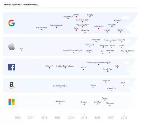 在 2016 年 7 月,General Motors 用接近 10 亿美元收购了 Cruise Automation。2016 年 8 月,Uber 以 6.8 亿美元的价格收购了自动驾驶初创公司 Otto。Ford 同意给 Argo AI 投资 10 亿美元。根据 CB Insights 提供的数据,从 2010 年开始,Google 收购了 14 家 AI 初创公司,紧随其后的 Apple 收购了 13 家。在 2017 年,AI 初创公司的收购增加了 44%。下图展示了最近几年 AI 初创公司的收购情况: