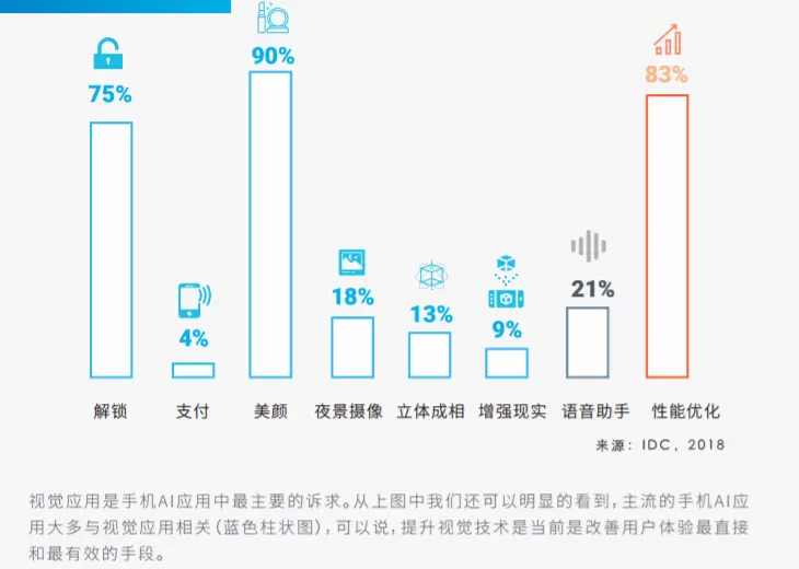 在用户主要诉求调查中,用户对于美颜的需求占比达到了90%,用户对于语音助手有需求的比例为21%,对手机便利解锁需求有强烈需求的占比为75%,而以上这些用户翘首以盼的手机新功能改进新功能实现,都需要AI技术来做支撑。