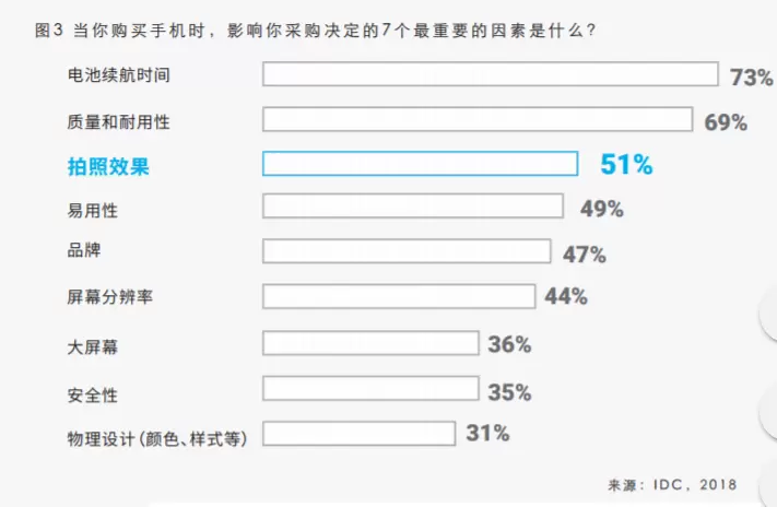《IDC手机行业白皮书》中的观点认为,经过十年的黄金发展期,在2017年,智能手机行业遇到了发展的重要转折点。此外,我们看到终端消费者的购买行为正在发生转变,“品质”正在成为重要的考量因素之一。IDC对中国2018年上半年出货量前100名的手机型号(TOP100型号占中国上半年智能机出货量的91%),共计1.6亿部的手机进行分类统计,其中提供AI功能的手机占比已经接近90%,但是真正具备全部AI能力的手机还不足10%,“AI手机”市场还有非常大的提升空间。