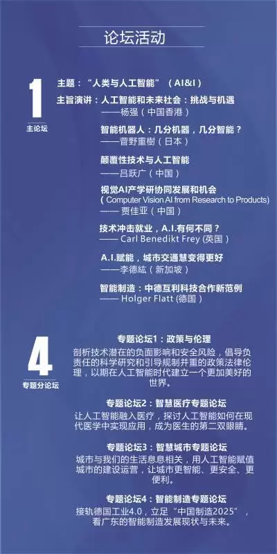 本次论坛得到了国际组织的大力支持和参与;国家有关部门领导,广东省、地市政府及相关部门领导将莅临出席;数十位国内外人工智能领域知名科学家、学者、产业界代表将发表主题演讲。
