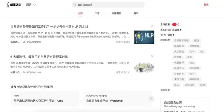 机器之心于 2018 年 10 月正式上线了全球首款人工智能领域垂直搜索 (www.jiqizhixin.com),旨在基于人工智能领域信息及知识需求特点,为 AI 人打造高质量的专属搜索体验。机器之心团队对人工智能领域进行了系统的本体工程,抽象提取出 11 项人工智能领域核心主体类别,构建知识卡、资讯、数据、文章、案例等数十种信息组织形式系统,并基于此本体及信息组织系统索引了百万级人工智能领域知识主体以及全网数亿级人工智能信息条目,呈现为 AI 领域用户搜索需求量身定制的高质量搜索结果。