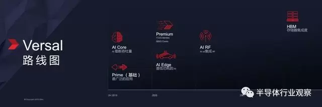 除此之外,关于Versal平台,Xilinx向我们展示了一个清晰的发展路线图。Victor表示:“Versal是一个非常灵活的架构,用户不需要必须每年要更换芯片才可以改善性能,提高功耗。所以Xilinx已经预见可以由此推出很多的子系列,包括?Versal 基础系列( Versal Prime),Versal 旗舰系列 (Versal Premium旗舰)系列和 HBM 系列,能针对要求最严格的应用提供业界领先的性能、连接性、带宽和集成功能。此外,该产品组合还包括?AI 核心系列(AI Core),AI 边缘系列 ( AI Edge) 和 AI 射频系列(AI RF),采用突破性的 AI 引擎。”