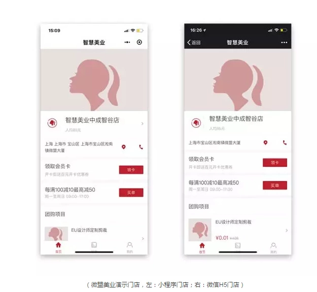 首先说展示,利用小程序,微盟给企业搭建了相应的“微店”系统,主要是用于企业宣传。相比于之前在公众号里给企业搭建的“微官网”,微站的流畅度要高很多(更贴近原生网站),流量入口也更多。