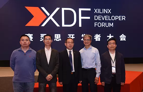 XDF大会合作伙伴合影。从左至右 阿里巴巴异构计算总监项午,阿里云FPGA研发总监 张振祥,浪潮集团总裁 李金,赛灵思CEO Vcitor Peng,华为FPGA加速云服务技术负责人张小华。