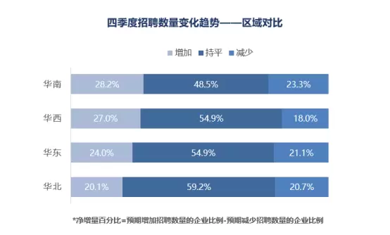 华南区预计扩招的企业占比连续三个季度处于四大区域之首。四季度预计扩招企业占比达到28.2%,预计减少招聘数据的占比为23.3%,净增量为4.9%。