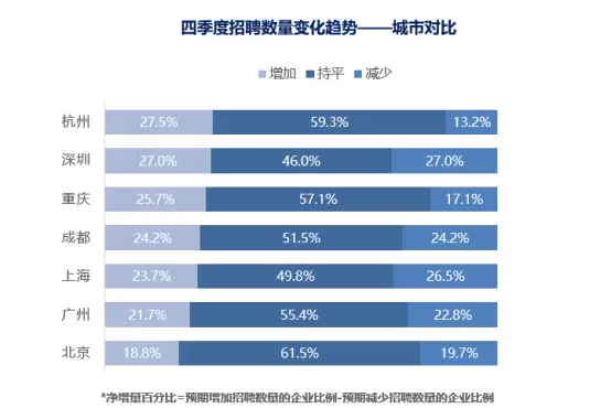 杭州第四季度预计扩招的企业占比最多,为27.5%,净增量14.3%,整体发展最为乐观。上海第四季度预计扩招的企业占比为23.7%,减少招聘的企业占比26.5%,净增量为-2.8%,整体发展最不乐观。北京和广州,第四季度预计企业扩招的净增量分别为-0.9%、-1.1%。