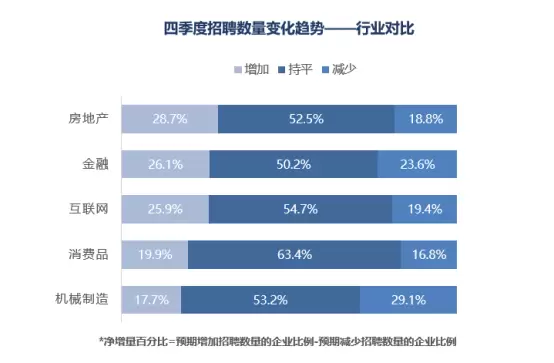 此外,金融行业和消费品行业净增量分别为2.4%和3.1%;机械制造业招聘需求净增量为-11.4%,预计第四季度最不乐观。