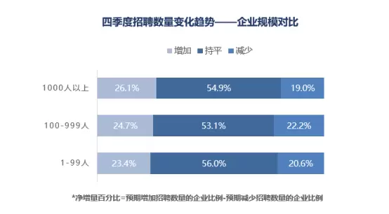 中型企业第四季度预计增加招聘数量的企业占比为24.7%,预计减少的企业占比22.2%,净增量2.5%;小微企业中,第四季度预计增加招聘数量的企业占比为23.4%,减少的企业占比为20.6%,净增量2.8%。