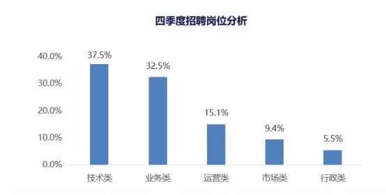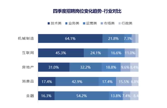 四季度各行业招聘岗位变化趋势方面,机械制造行业、互联网行业的技术类岗位需求远超其他行业,分别为64.1%、45.3%,这与它们以技术驱动创新保持一致。