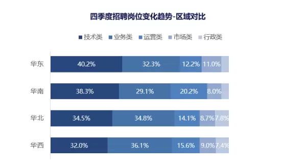 技术类岗位,华东需求最高,为40.2%,环比第三季度季度上升5.8%;业务类岗位,华西需求最高,为36.1%,环比第三季度上升1.5%;运营类岗位,华南需求最高,达到20.2%,环比第三季度上升3.8%。
