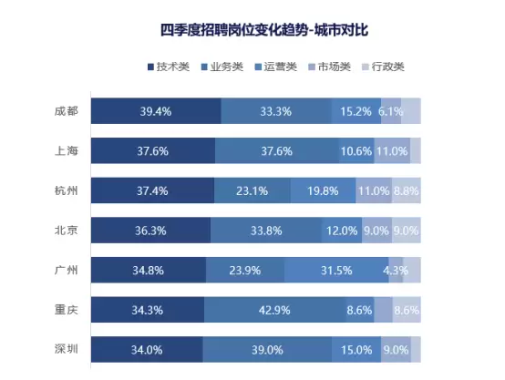 报告显示,各城市招聘岗位类型差异较大。纵向对比来看,预计2018年第四季度,成都技术类、重庆业务类、广州运营类、上海及杭州市场类、北京行政类需求最为旺盛。