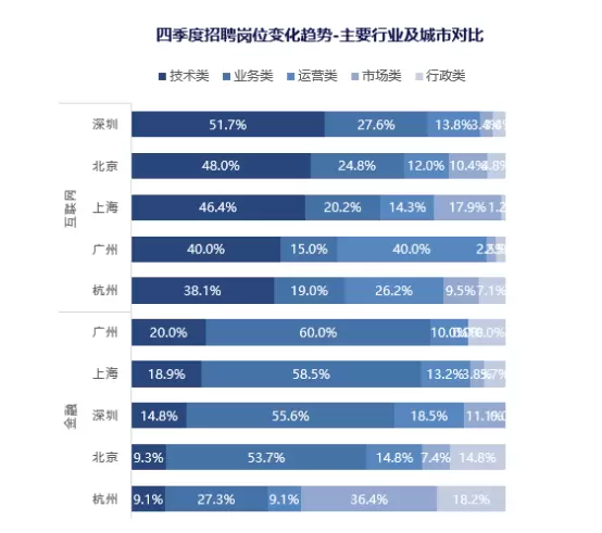 报告显示,在互联网企业中,深圳业务类、广州运营类、上海市场类、深圳技术类需求最为旺盛。