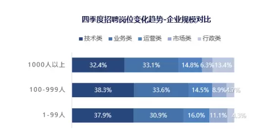 整体来看,预期第四季度各规模企业,对于业务和技术类岗位需求最为旺盛,且较为均衡。大型企业对于行政类岗位的需求最大,占比为13.4%,高于中小型企业之和;小微企业对市场类招聘需求略高于大型与中型企业,占比为11.1%。