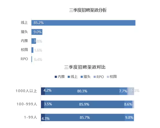 报告显示,2018年第三季度,大型企业的内推渠道及校园渠道使用较其他规模企业占比大,分别为4.2%、6.3%;小微企业在调查的企业中采用猎头渠道较其他规模企业占比最大,为9.8%。至于RPO(招聘流程外包)和校园渠道,小微企业在三季度基本没有选择使用。