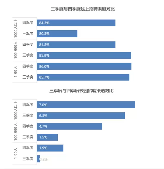 整体来看,预计第四季度采用线上招聘渠道的企业较第三季度持平,采用校园渠道招聘的企业较三季度略有增长。