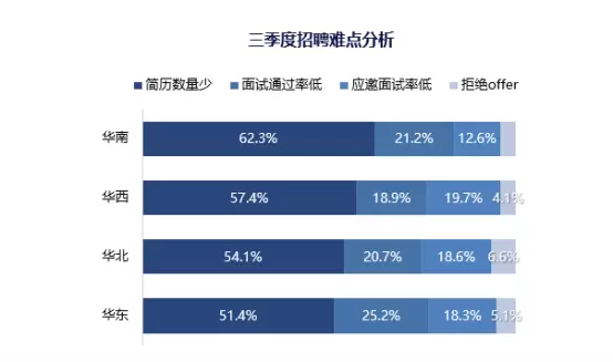 简历数量少基本成为各区域的首要招聘难点,华南和华西问题尤为突出,建议HR拓宽招聘渠道,特别是针对被动求职者,建议HR主动出击。